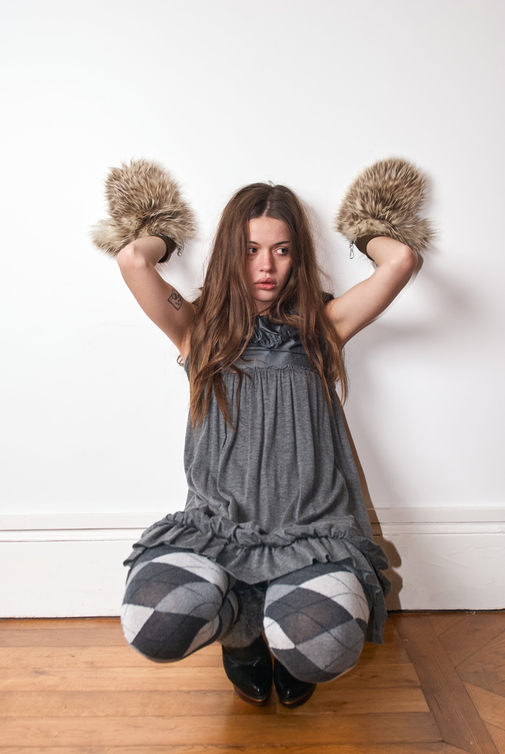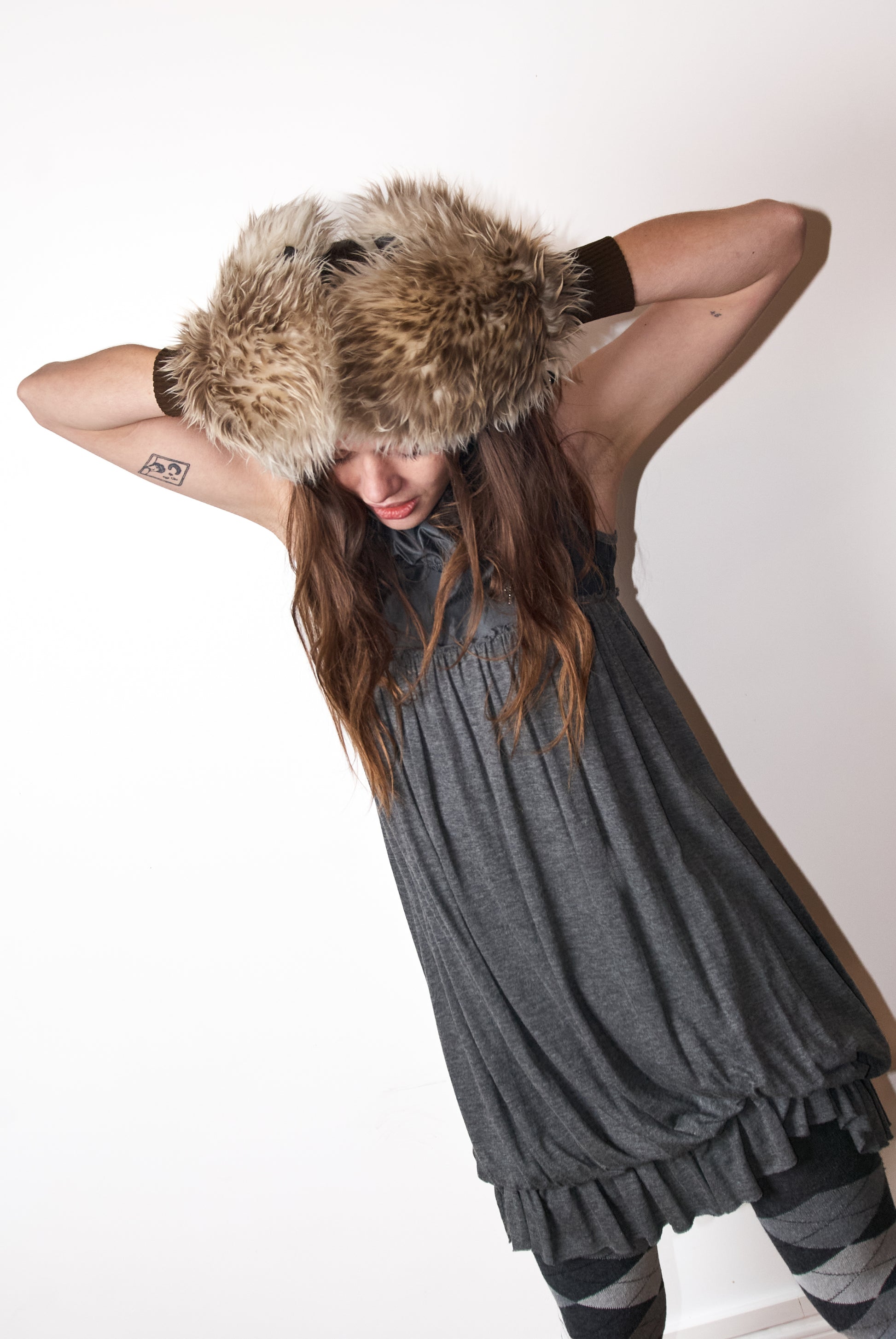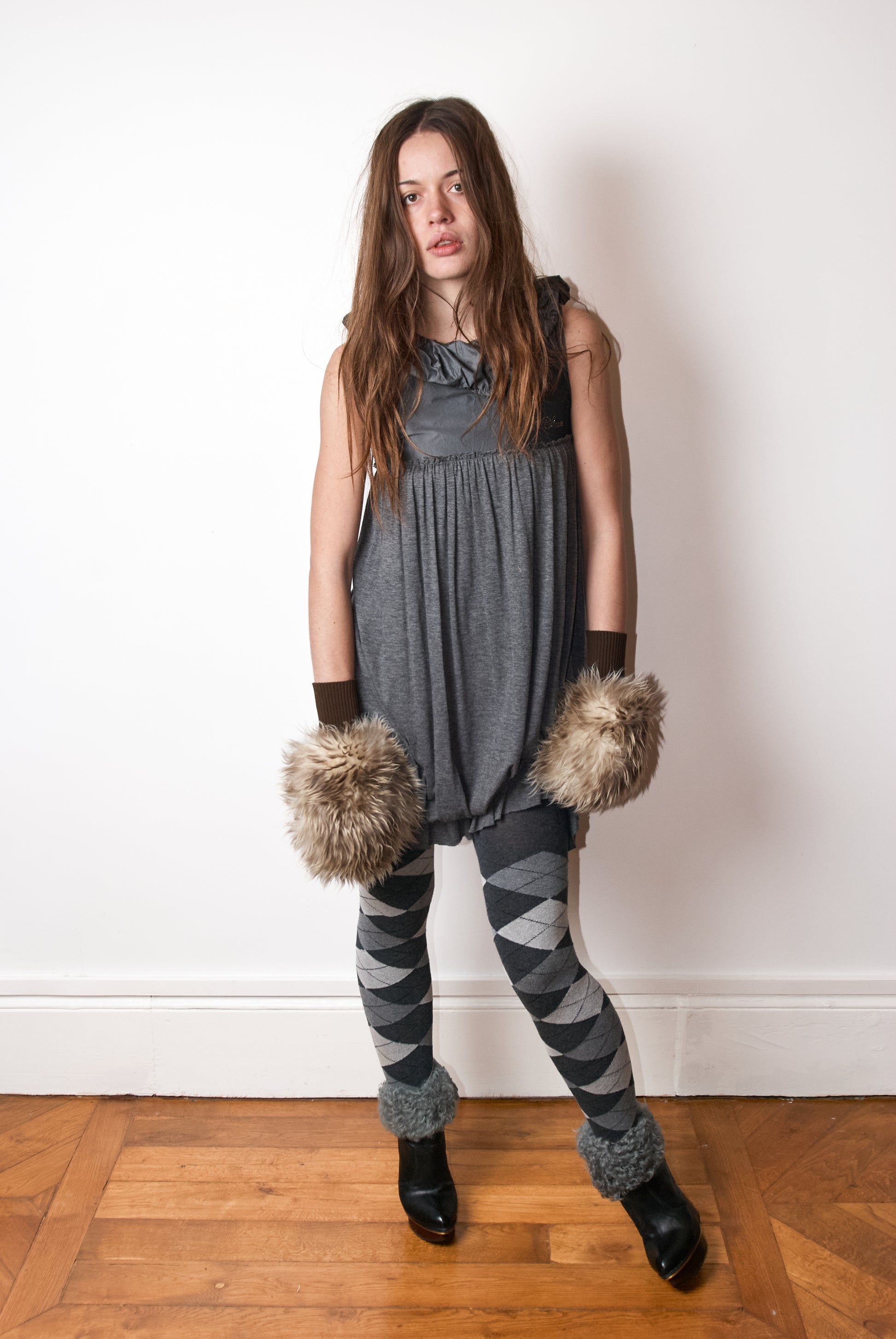 Vintage Italian bubble dress — grey sleeveless dress with a loose, gathered silhouette and ruffled hem. Lightweight, easy fit. Fits S–M.