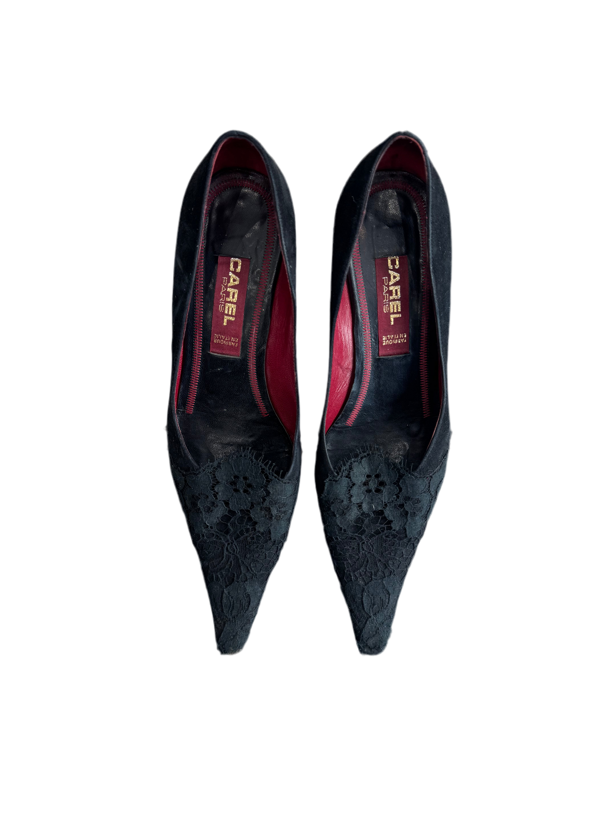 Elegant vintage black velvet heels with floral lace detailing and a pointed toe. Finished with Carel’s signature red lining and a classic kitten heel.
