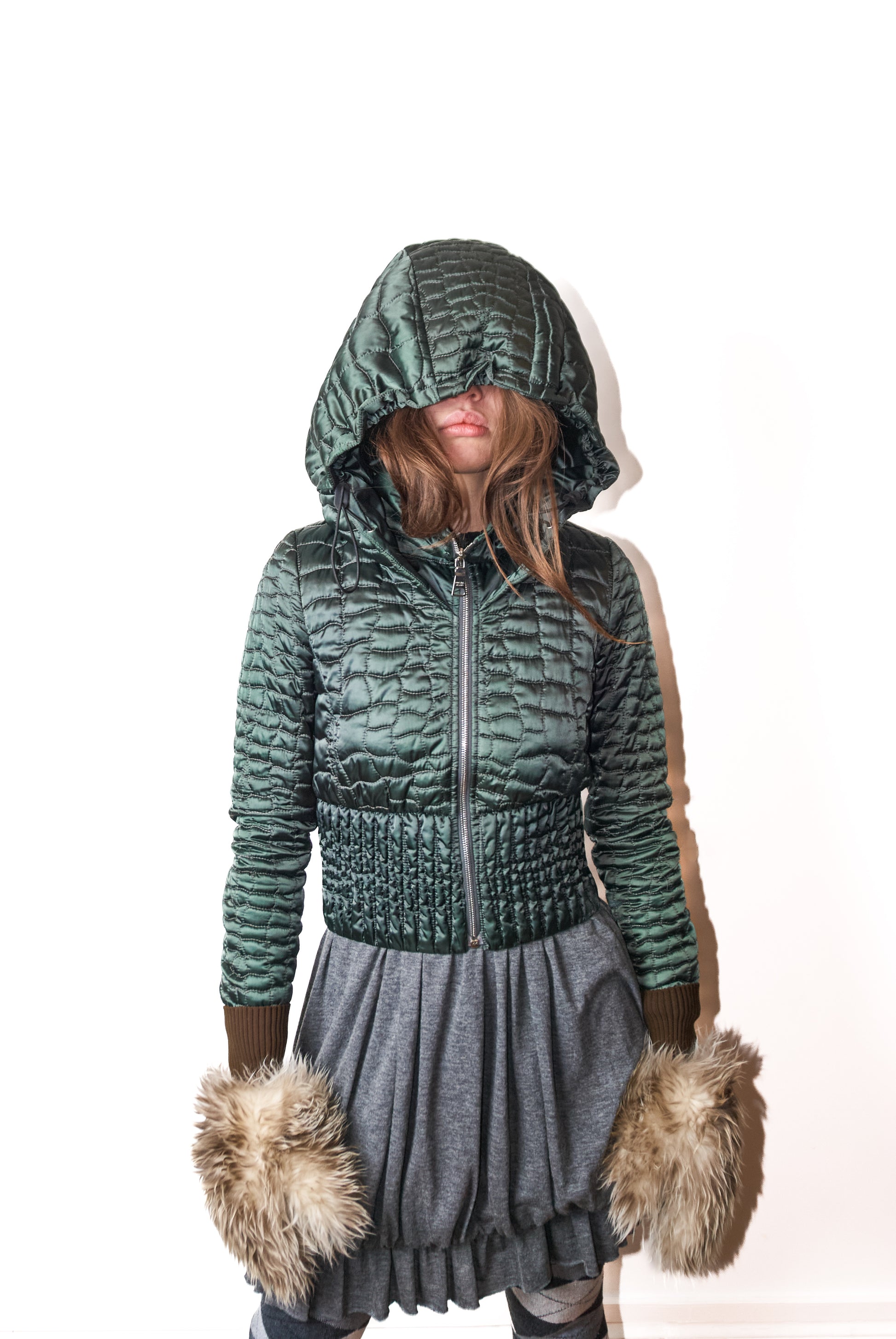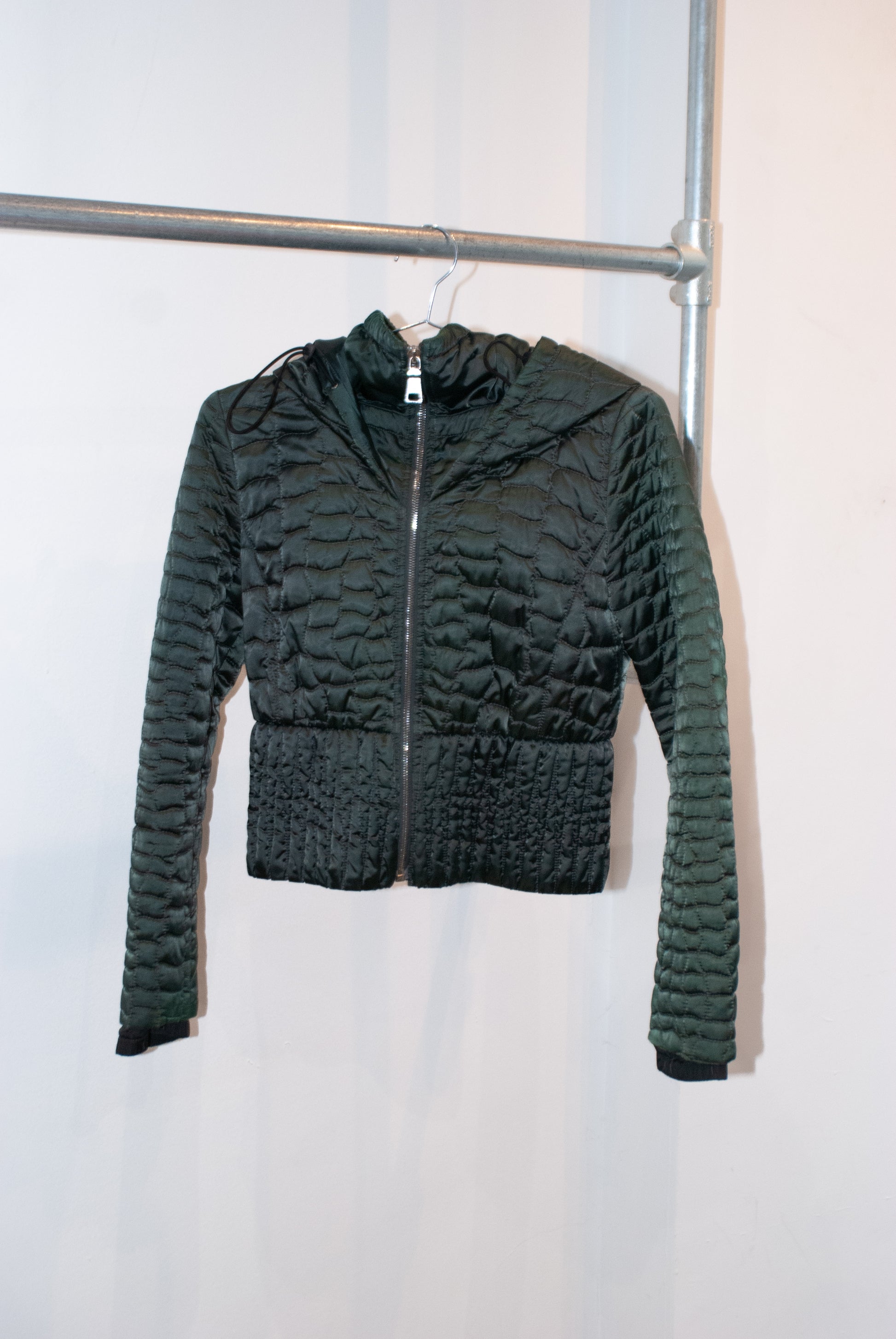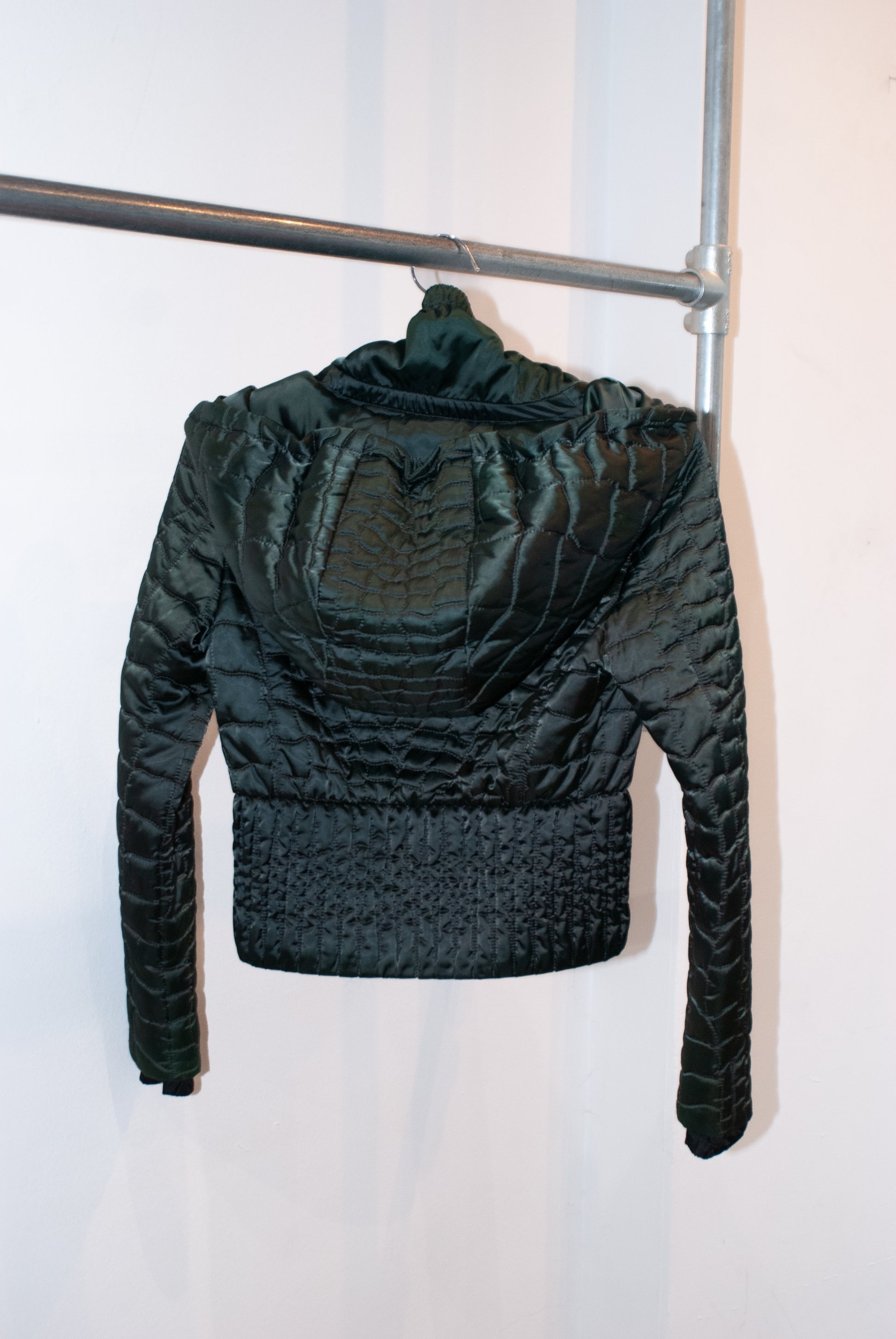 Prada black hooded puffer jacket — slightly padded with a sculpted, oversized design. Features a wide elasticated waistband, front zip closure, and a generous attached hood.
